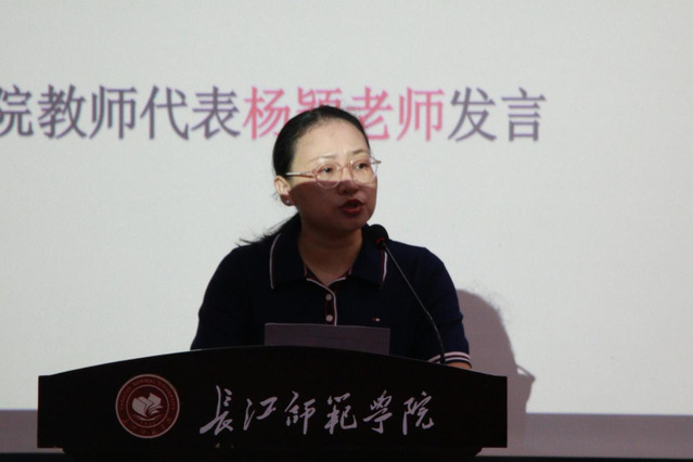 教师代表杨颖老师在发言中指出,大学四年充满挑战、不进则退,勉励同学们要劳逸结合,同时着力提升表达与沟通能力。她最后向全体2025级新生表达了热烈的欢迎与美好祝福。