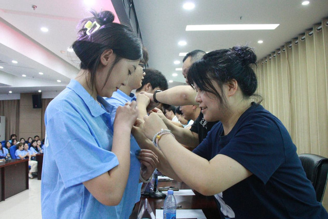 典礼上,学院领导老师为新生代表佩戴校徽。这一庄重仪式,不仅拉近了师生距离,更彰显了传媒学院深厚的师生情谊。