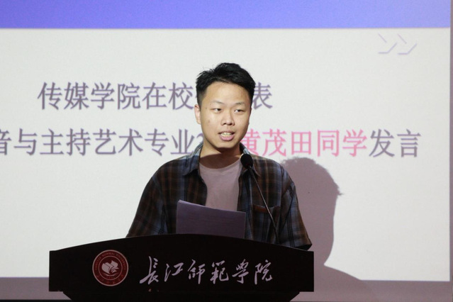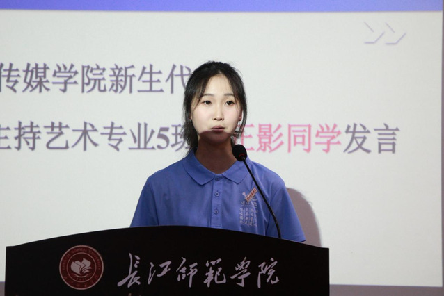 此外,2025级播音与主持5班杨正影同学作为新生代表发言,表达了对在传媒学院与同学们相聚的喜悦,并倡议全体新生在未来学习生活中共同进步、严于律己、精研专业知识、提升综合素养,以实际行动为学校增光添彩。