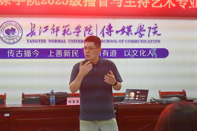 又讯 9月11日15时,传媒学院播音与主持艺术专业在2308教室举办2025级新生入学教育专题讲座。系主任杨竞豪担任主讲人。