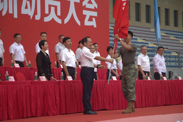 大会进入激动人心的授旗环节。校党委书记黄大勇同志将军训团团旗郑重授予军训团团长。鲜红的团旗在秋日阳光下熠熠生辉,团长接过旗帜,奋力挥展,全场爆发出雷鸣般的掌声。紧接着,黄大勇书记庄严宣布:“长江师范学院2025级新生军训,现在开始!” 铿锵有力的话语点燃了全场激情,掌声、欢呼声经久不息,2025级新生的军训征程正式拉开帷幕。