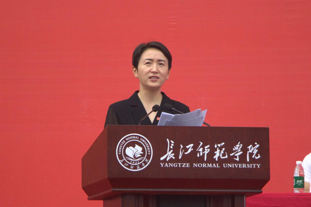 校党委副书记、校长杨燕滨教授发表讲话。她首先代表学校党政领导班子和全体师生员工,向2025级新同学表示最热烈的欢迎!向承训部队官兵致以崇高敬意!向莅临大会的校友代表和辛勤耕耘的教职工表示衷心感谢!杨校长在讲话中指出,面对以人工智能为代表的新一轮科技革命浪潮,新时代青年要勇立潮头、积极适应。她介绍了学校近年来在国际交流与合作方面取得的显著成果,强调开放办学理念。杨校长深情寄语全体新生:要以严格自律锤炼意志、收获成长,认真践行军训各项要求,传承弘扬“学高身正、敬业自强”的长师精神,努力成长为兼具家国情怀与国际视野的时代新人,在长江师范学院这片沃土上书写精彩绚烂的青春篇章。
