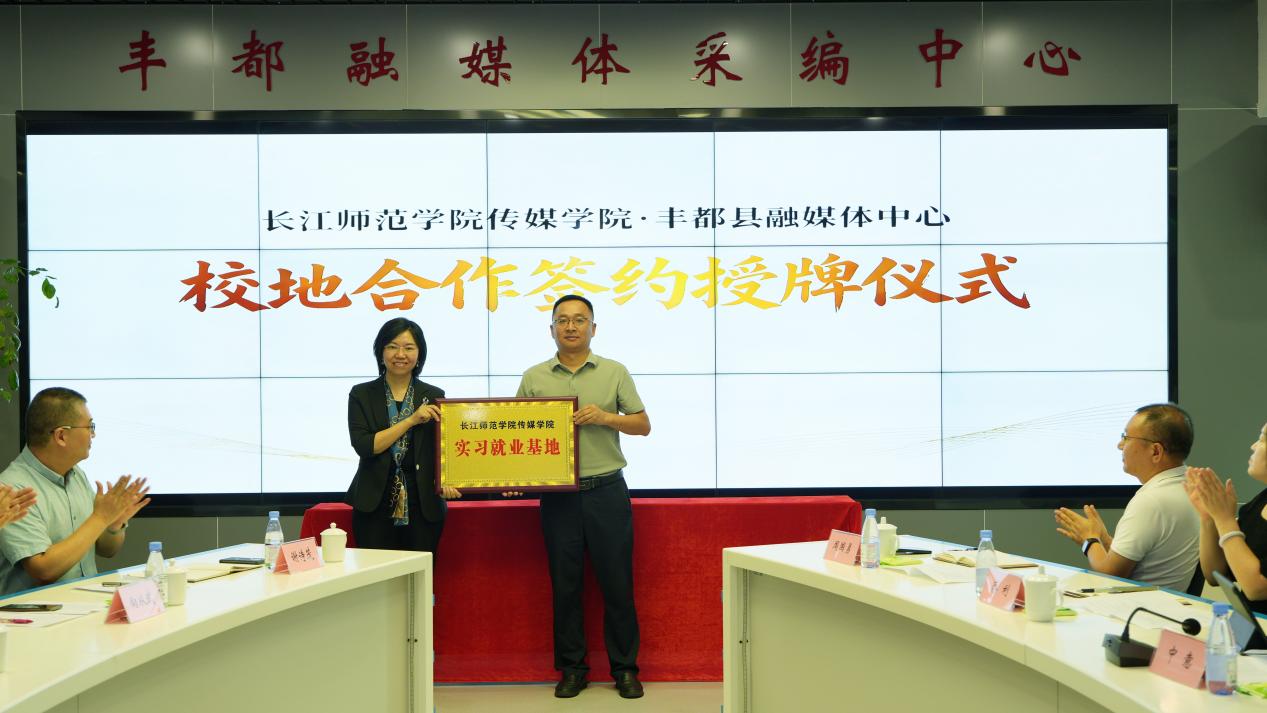 为进一步夯实合作基础,在与会人员的共同见证下,双方代表正式签署了校地合作协议。向丰都县融媒体中心进行了“实习就业基地”授牌。