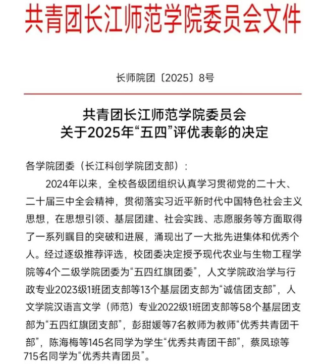 在长江师范学院2025年“五四”评优表彰中,传媒学院团委及师生表现优异,荣获“五四红旗团委”等多项集体与个人荣誉。