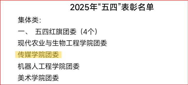 传媒学院团委始终聚焦主责主业,在夯实基层组织建设、深化社会实践育人等方面取得了扎实成效。此次获评“五四红旗团委”等荣誉,是对学院共青团工作的充分肯定。各获奖团支部在学院团委指导下,积极发挥政治功能和组织功能,不断提升引领力、组织力、服务力,在思想引领、学风促进、校园文化建设中展现了良好风貌。